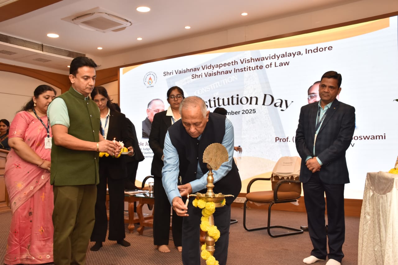 Shri Vaishnav Institute of Law (SVIL), Shri Vaishnav Vidyapeeth Vishwavidyalaya, Indore, commemorated Constitution Day on 26 November 2025 with great enthusiasm and academic engagement. The event was graced by Hon’ble Justice V. S. Kokje, former Chief Justice of the Rajasthan High Court and former Governor of Himachal Pradesh, as the Chief Guest.