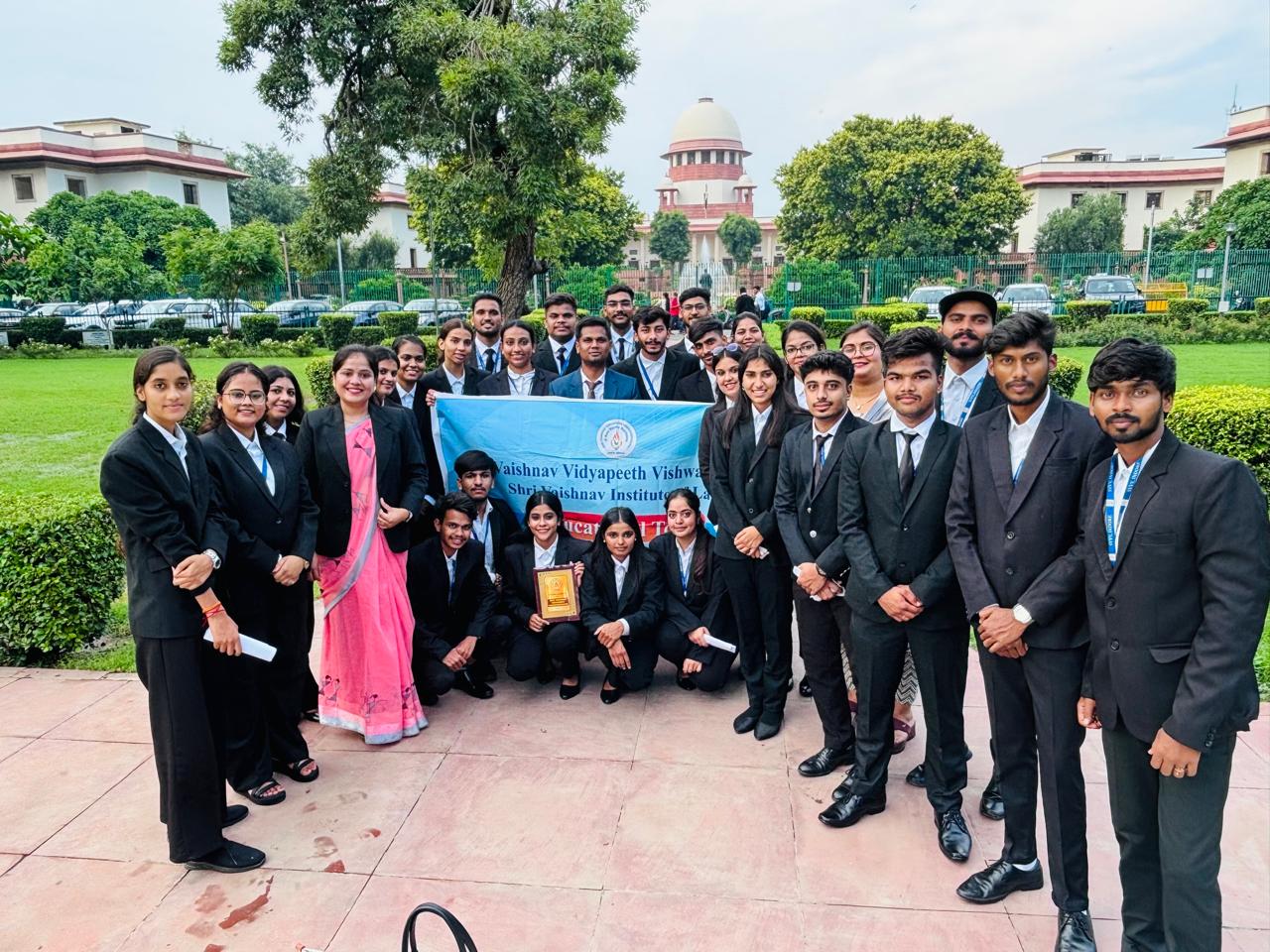 On 19 August 2025, students of Shri Vaishnav Institute of Law (SVIL), Shri Vaishnav Vidyapeeth Vishwavidyalaya, Indore, visited the Supreme Court of India, New Delhi, for academic exposure to the country’s apex judicial institution. The visit, organized under the guidance of Dr. Ashutosh Bairagi (HoD, SVIL), and coordinated by Mr. Pranay Patel (Assistant Professor), along with faculty members Ms. Akanksha Surana and Ms. Priya Nigam, provided students with valuable insights into judicial functioning and court procedures.